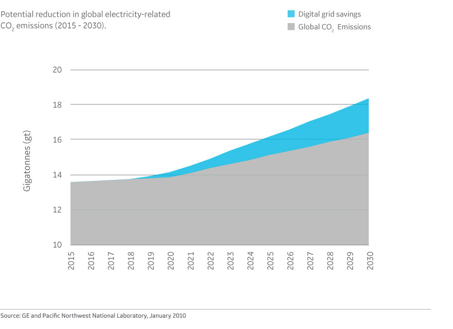 The latter two outcomes, while economically powerful, also bring with them the added benefit of reducing the environmental impact associated with electricity production and delivery. Digital grid technologies have the potential to reduce electricity-related carbon dioxide (CO2) emissions in the United States by up to 12 percent by 2030, according to a report by the Pacific Northwest National Laboratory. If this number is scaled globally, that’s equivalent to reducing global CO2 emissions by 2 billion metric tons per year by 2030. This is the same carbon impact as taking 1 million passenger cars off the road—about half of the passenger cars in use globally.